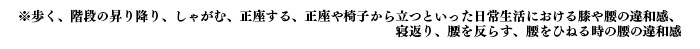 ※歩く、階段の昇り降り、しゃがむ、正座する、正座や椅子から立つといった日常生活における膝や腰の違和感、寝返り、腰を反らす、腰をひねるときの腰の違和感